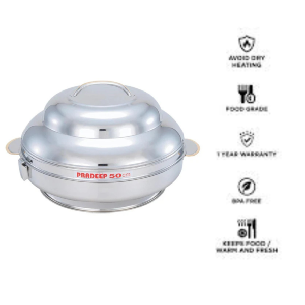 The Pradeep Sparkling Jumbo Stainless Steel Hot Pot, 40 cm is a versatile and elegant solution for large-scale dining needs. Designed with a sparkling stainless steel finish, this hot pot adds a touch of sophistication to any table setting, while its durable construction ensures long-lasting use. The generous 40 cm diameter makes it perfect for serving large quantities, ideal for hotels, restaurants, and catering services. Not only is it built to handle heavy use, but it is also easy to clean, making it a convenient choice for professionals. Whether it’s a banquet, buffet, or event, this hot pot guarantees that food stays warm and ready to serve, delivering both style and practicality.