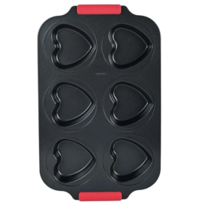 - 6-piece pan with heart-shaped molds for unique, appealing muffins.